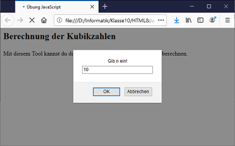 Erstelle ein HTML-Dokument, das die Kubikzahlen n3 bis zu einer bestimmten Zahl n ermittelt und ausgibt! Verwende für diese Aufgabe eine zählergesteuerte Schleife! Die Zahl n soll über eine Eingabeaufforderung übergeben werden!